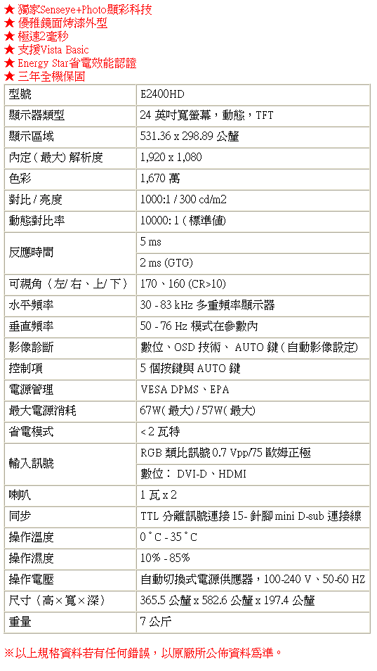 BENQ E2400HD官方數據