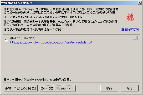 下面要談談firefox的AutoProxy擴展,安裝好這個擴展並重啓firefox以後,會自動彈出這個窗口: