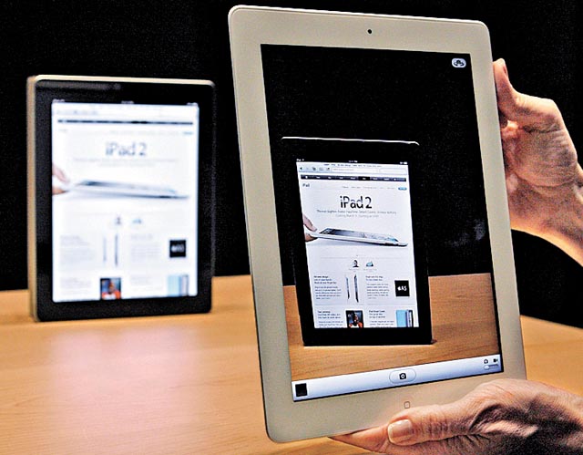 記者和粉絲拿起 iPad 2試玩。路透社