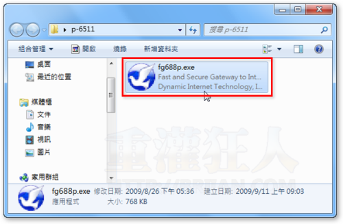 第1步  將自由門軟體下載回來並解壓縮之後,請先將整個資料夾複製到「C:\Program Files」資料夾或其他存放軟體的位置,然後在「fg688p.exe」檔案上按兩下滑鼠左鍵執行該軟體。