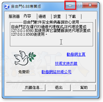 自由門軟體的使用方式相當簡單,一般來說只要執行了軟體再把視窗縮到最小即可正常運作。如果不想透過自由門上網的話,只要把軟體關閉即可。