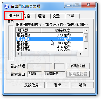 第5步  另外如果你發現藉由自由門連上網時速度很慢,或無法正常連線到常用網站,可以在「服務器」設定頁面中點選、切換到其他代理伺服器來用。或者請將IE瀏覽器關閉,關掉重開自由門軟體之後再重開IE瀏覽器,讓他自動重新搜尋、設定可用的代理伺服器來上網