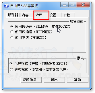 第6步  另外自由門也提供了F3通道、F2通道與SSL加密通道等方式來對外連線,如果你發現原本的方式無法正常上網,請從這邊挑選其他加密通道來試試看。