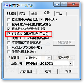 第7步  如果你希望電腦一開機就能自動透過自由門來上網的話,請在「設置」頁面中勾選「在啟動計算機時啟動自由門」這個選項,以後便可在上網時自動透過各式加密通道對外連線。