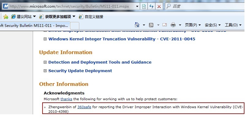 圖片說明:微軟就“長老”漏洞向360工程師公開致謝